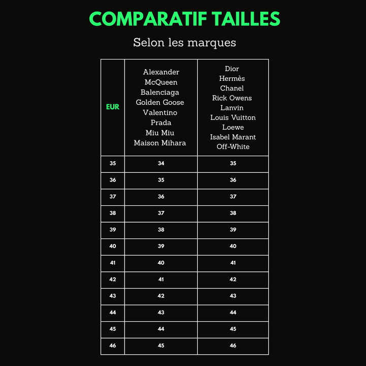 Il peut parfois être difficile de trouver sa pointure dans les marques de luxe. Certaines sont sur des pointures italiennes et d'autres européennes. C'est pour cela que nous avons fait un tableau récapitulatif de l'intégralité des marques de luxe que nous proposons chez Renatus (alexander mcqueen, valentino garavani, dior, golden goose, louis vuitton, chanel, rick owens, prada, miu miu, loewe, maison mihara yasuhiro, balenciaga, hermès, isabel marant...) avec la conversion en pointure EUR.